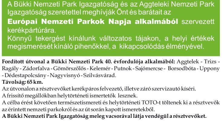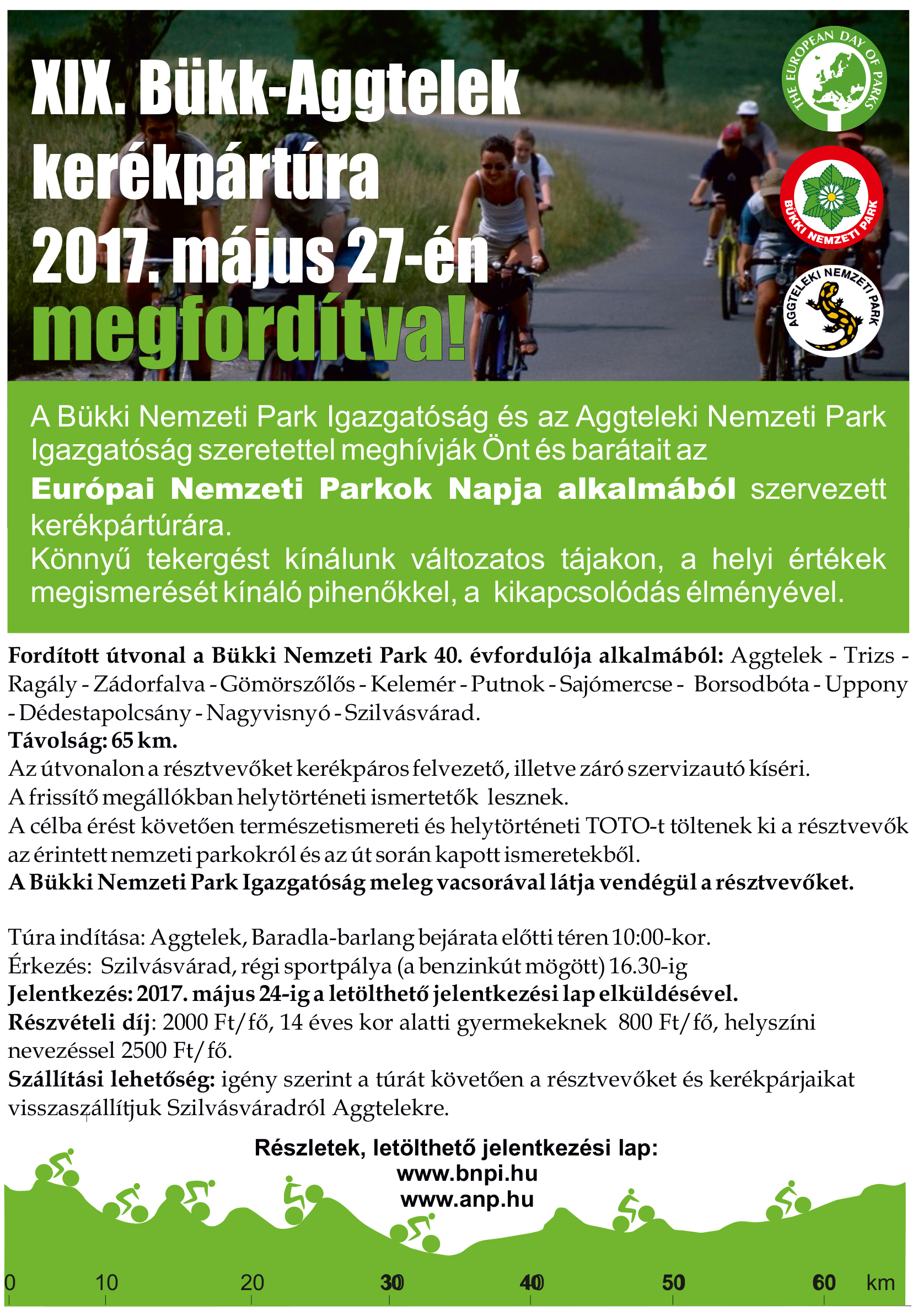 A Bükki Nemzeti Park Igazgatóság és az Aggteleki Nemzeti Park Igazgatóság közös szervezésében kerül megrendezésre 2017. május 27-én immár 19. alkalommal a Bükk-Aggtelek kerékpártúra. A Bükki Nemzeti Park Igazgatóság 40 éves jubileuma alkalmából rendhagyó túra indul Aggtelekről, mely Szilvásváradon zárul. Várunk minden biciklizni vágyót és természetet kedvelőt!Tekerj a természetért!