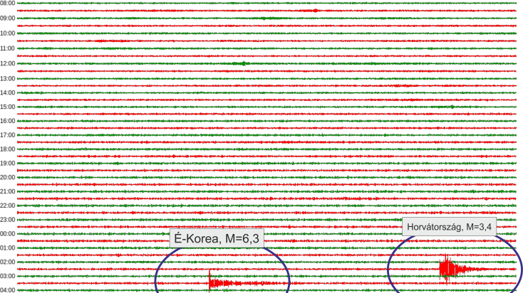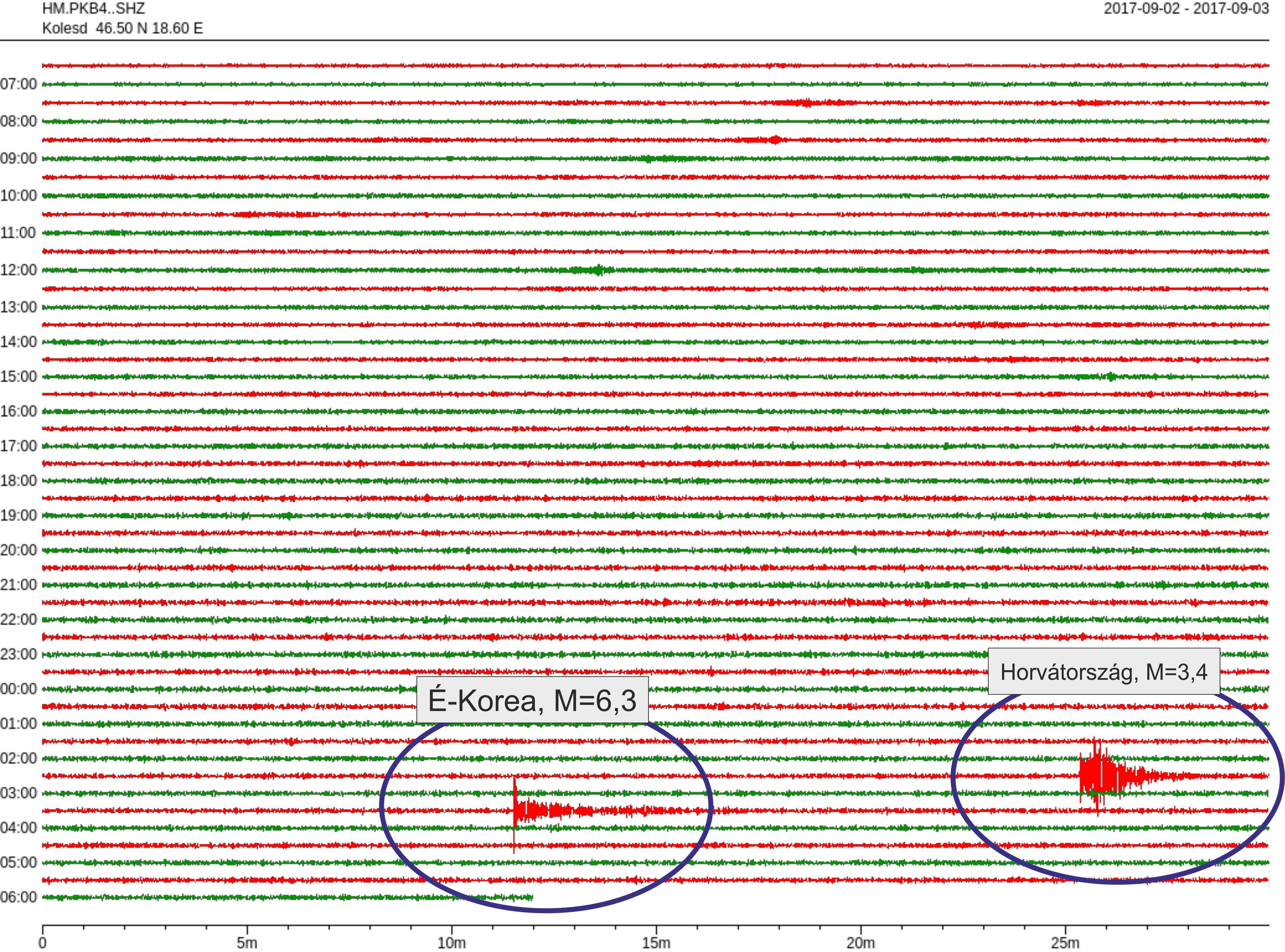 2017.09.03-án hajnalban, 03:30-kor 6.3 magnitúdójú szeizmikus eseményt regisztráltunk Észak-Korea területén. Az esemény nagy valószínűséggel robbantás (atomrobbantás) volt. A magnitúdó alapján a robbantás közel 100 kt töltetű lehetett. A Paks II mikroszeizmikus hálózathoz tartozó kölesdi lyukszeizmográf állomás szeizmogramján jól látszik 02:55-kor egy kisebb horvátországi M 3.4 magnitúdójú földrengés. Az Észak-Koreában 03:30-kor végzett atomrobbantás hullámai pedig kb. 12 perc alatt tették meg a több ezer km-es távolságot és 03:42-kor érték el a magyar mérőállomást.