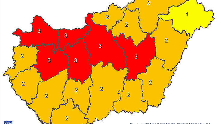 A szolgálat vasárnapra a viharos szél miatt Győr-Moson-Sopron, Komárom-Esztergom, Veszprém, Fejér, Pest és Jász-Nagykun-Szolnok megyére harmadfokú piros figyelmeztető előrejelzést adott ki. Az OMSZ azt írta, vasárnap a déli órákban egy gyors mozgású hidegfront halad át az ország felett észak-déli irányban, a délelőtti órákban viharos 60-85 kilométeres széllökések lehetnek, amelyek később többfelé 70-150 kilométeressé is erősödhetnek.