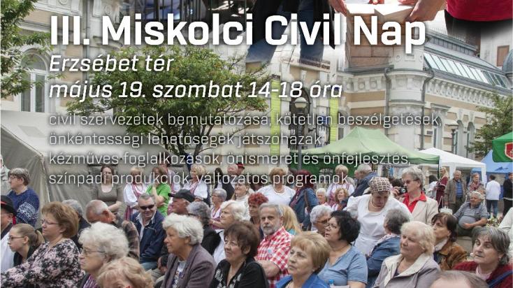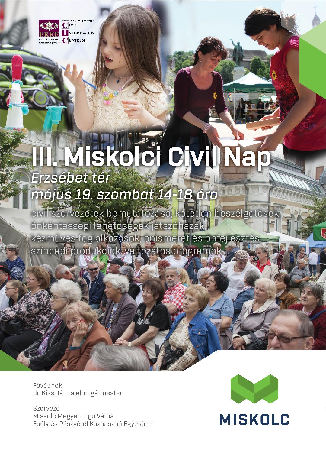 Idén harmadik alkalommal szervezi meg Miskolc Megyei Jogú Város Önkormányzata és az Esély és Részvétel Közhasznú Egyesület – Borsod-Abaúj-Zemplén Megyei Civil Információs Centrum a „Civil Napot”. A Miskolc Város Ünnepéhez kapcsolódó esemény a megszokott helyszínen, az Erzsébet téren várja az érdeklődőket. A Miskolcon tevékenykedő civil szervezetek, közösségek 2018. május 19-én, szombaton délután 2 - 6 óra között színpadi produkciókkal, standokkal várják a látogatókat. A rendezvény fővédnöke: dr. Kiss János alpolgármester
