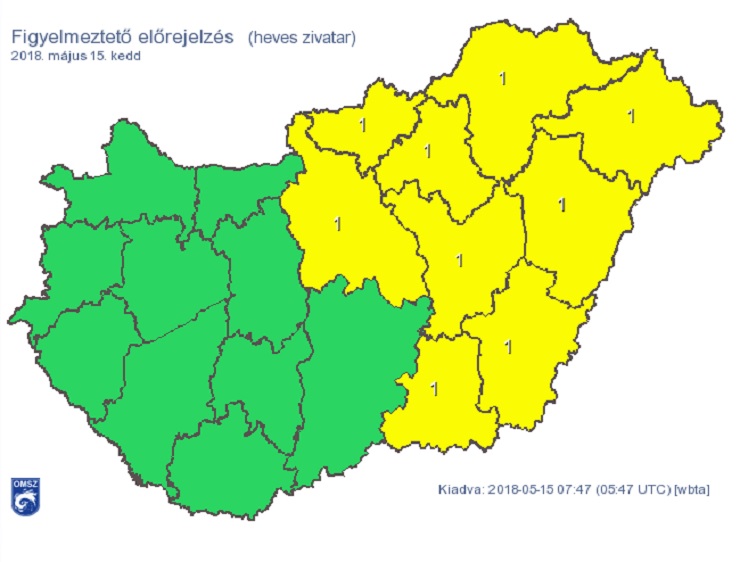 A délelőtti órákban az eső, zápor mellett legfőképp a déli, délnyugati országrészben, illetve a középső területeken alakulhat ki néhol zivatar, majd napközben egyre inkább inkább az ország északkeleti harmadán és a Dunántúl északnyugati felén számíthatunk rájuk. A zivatarokat lokálisan jelentősebb mennyiségű csapadék (>15-20 mm), viharos szél (>60-70 km/h) és kisebb méretű jég kísérheti. Az ország keleti, északkeleti részében egy-egy intenzívebb zivatar sem zárható ki >80 km/h széllökés, >2 cm átmérőjű jég kíséretében.