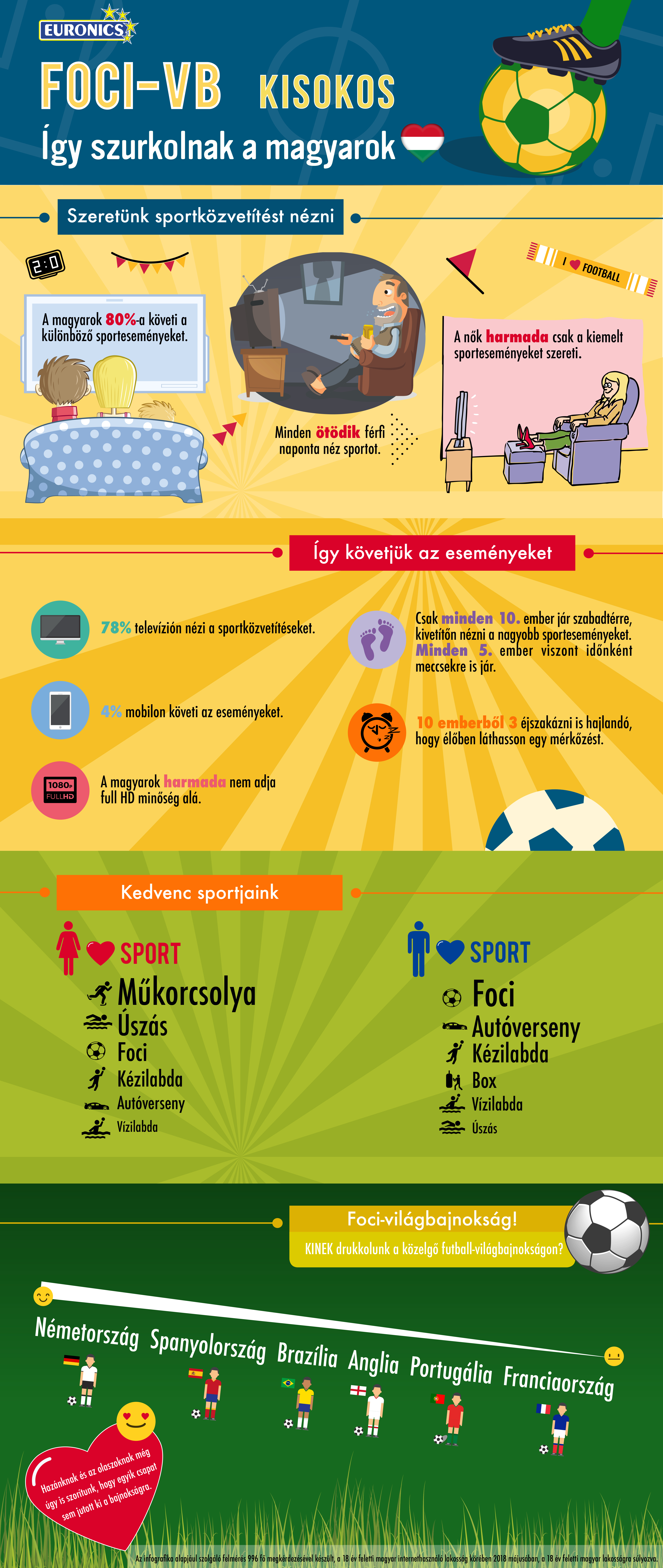 Valóban sportnemzet vagyunk, pláne, ha nem sportolásról, hanem szurkolásról van szó. A magyarok több, mint 80%-a eltérő gyakorisággal, de követi a különböző sporteseményeket, a legnépszerűbb sportág a futball. A közvetítéseket elsöprő többségben televízión nézzük, és a lakosság harmada nem adja full HD minőség alá, derült ki az Euronics Műszaki Áruházlánc legfrissebb felméréséből*. A hamarosan induló labdarúgó-világbajnokságon Borsod-Abaúj-Zemplén megyében a legtöbben a németeknek drukkolnak majd. De hogy emellett sportolni is hajlandók vagyunk-e? Az Euronics felmérése erre is rámutat!