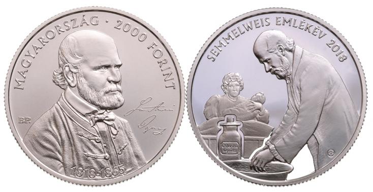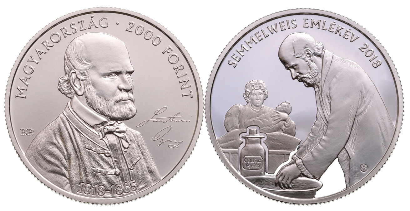 Az emlékérmék a Semmelweis-emlékév keretében jelennek meg – közölte az MNB pénteken. Mindkét érme azonos érmeképpel jelenik meg, csak értékjelzésükben különböznek: előlapjukon Semmelweis Ignác félalakos portréja látható kézjegyével és ruházatába rejtve az 1818-1865 évszámokkal, amelyek Semmelweis Ignác születési és halálozási évére utalnak. Itt találhatók a kötelező alaki kellékek is; a 10 ezer és 2 eezr forint értékjelzés, a Magyarország felirat, valamint a különleges biztonsági elemet is tartalmazó BP. verdejel.