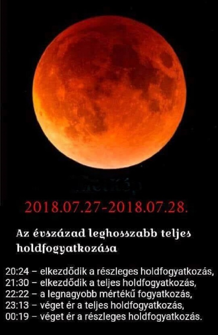 2018. július 27-e éjjelén jól megfigyelhető, hosszú (1 óra 43 perc!), centrális holdfogyatkozás lesz. Az égi látványosságot csak a fránya időjárás befolyásolhatja. Centrális holdfogyatkozásnak az olyan holdfogyatkozást nevezzük, amikor a Hold legalább egy része áthalad a földárnyék középpontján. Holdfogyatkozás akkor jön létre, amikor a Föld a Nap és a Hold között tartózkodik, ilyenkor a Föld árnyéka a Holdra vetül. Kezdetben a Föld félárnyéka, majd a teljes holdfogyatkozásnál a “teljes” árnyéka – umbra – “takarja be” égi kísérőnket. Holdfogyatkozáskor a Föld árnyékának fénytörése miatt egyre vörösesebbnek látjuk majd a Holdat.