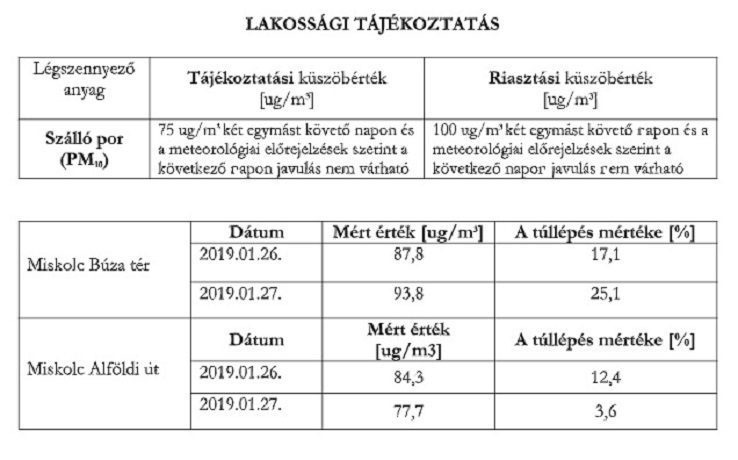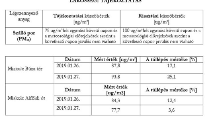Miskolc Meegyei Jogú Város Polgármesteri Hivatala ezúton tájékoztatja a Tisztelt Lakosságot, hogy az automatikus mérőállomásokon a szálló por (PM10) koncentráció túllépte a tájékoztatási küszöbértéket, ezért a 306/2010. (XII.23.) Korm. rendelet és a 30/2013.(X.1.) önkormányzati rendelet alapján elrendelték a füstköd-riadó tájékoztatási fokozatát.