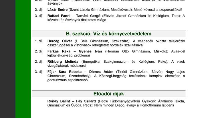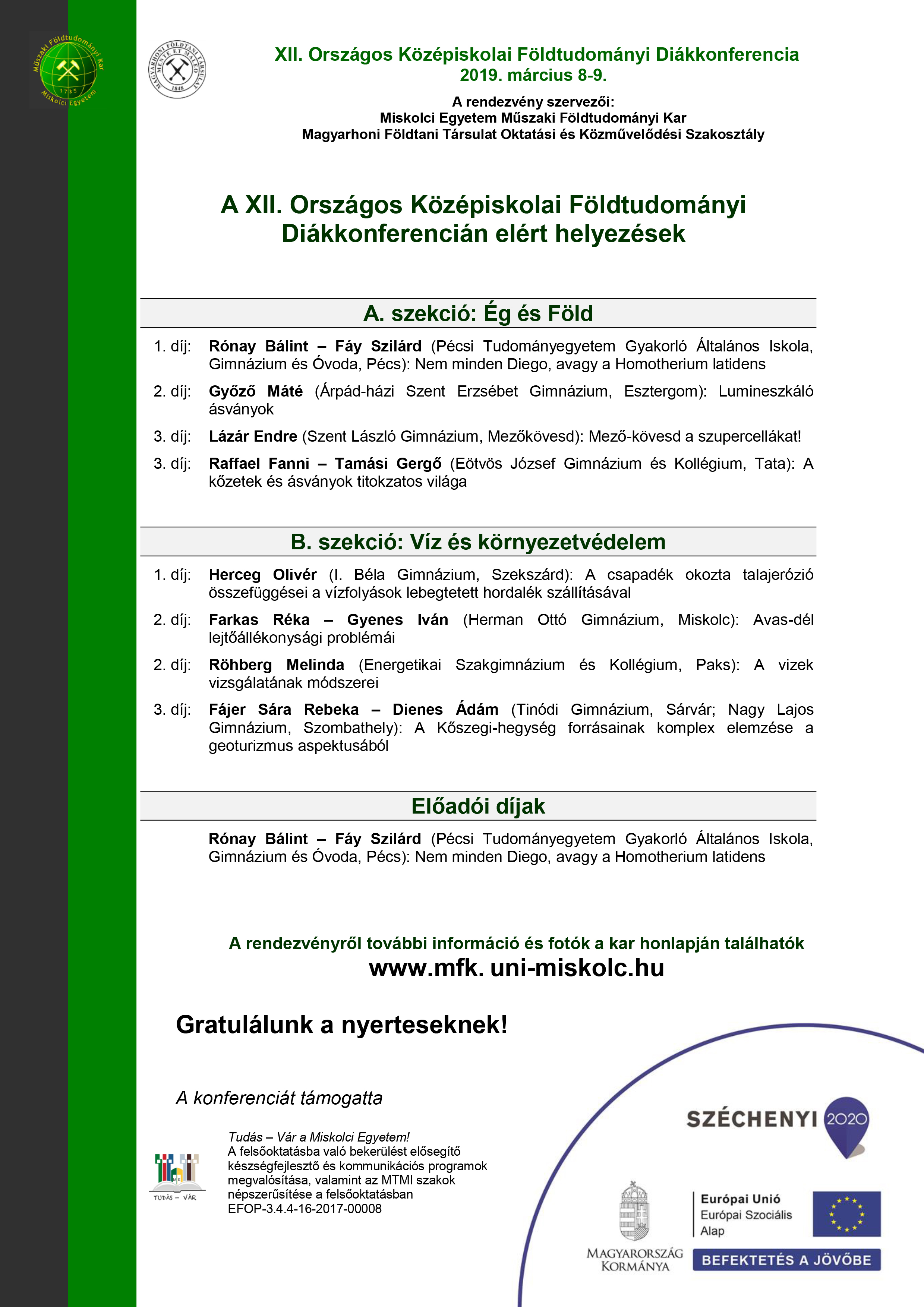 A szombati eredményhirdetésen Dr. Mádai Ferenc, a Műszaki Földtudományi Kar dékánhelyettese gratulált minden résztvevőnek, majd átadta az okleveleket és a tárgynyereményeket. A szekciókban kiosztott díjazások mellett a legfontosabb elismerés, hogy a zsűri által legjobbnak ítélt elsődíjas és különdíjas középiskolás kutató diákok jogosultságot szerezhettek az Országos Tudományos Diákköri Konferenciára való nevezésre a témájuknak megfelelő szekcióba. Ott a dolgozataik az egyetemi előadásokkal azonos szabályok szerint kerülnek megmérettetésre. Amennyiben az OTDK szekció zsűrije úgy ítéli meg, hogy a középiskolás diák munkája díjat érdemel, számára az OTDK bármely helyezése, díja, illetve az "OTDK junior díja" adható. A konferencia keretében három ilyen nevezési javaslat került megfogalmazásra. A konferencia zárását követően a diákok csatlakoztak az ásványfesztivál szakmai programjához, majd belevetették magukat a csodálatos ásványok és drágakövek erdejébe. A konferencia programja a Tudás – Vár a Miskolci Egyetem! A felsőoktatásba való bekerülést elősegít készségfejlesztő és kommunikációs programok megvalósítása, valamint az MTMI szakok népszerűsítése a felsőoktatásban c. EFOP-3.4.4-16-201700008 pályázat keretében valósulhatott meg.