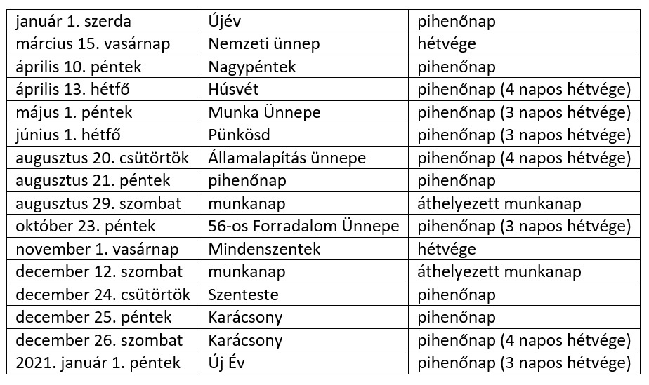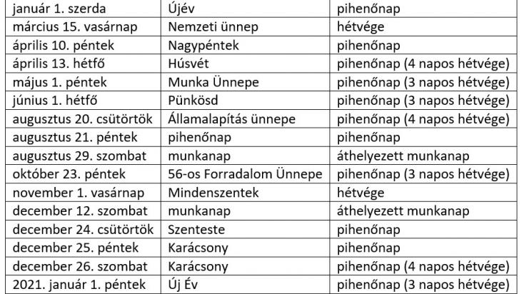 Ünnepnapok, pihenőnapok, hosszú hétvégék és a ledolgozós szombati munkanapok 2020-ban így alakulnak: