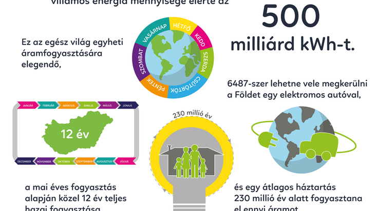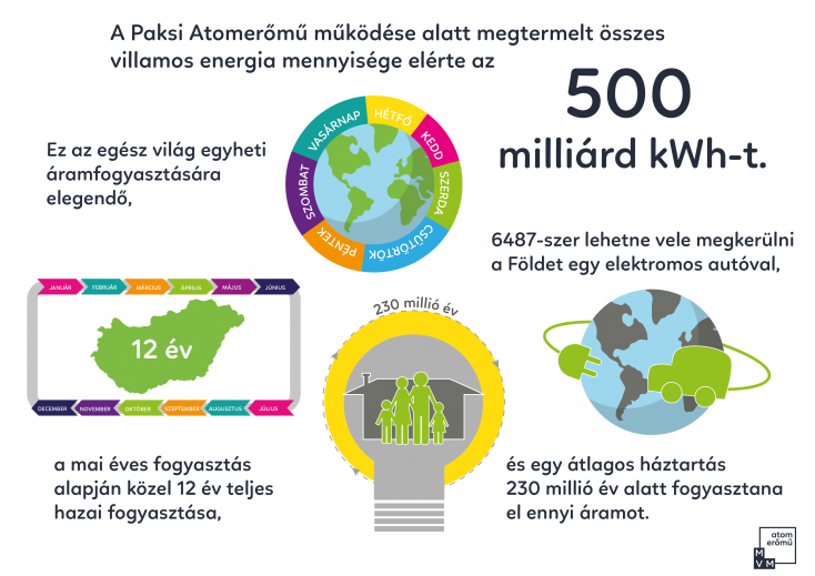 A termelés 1982-es indulása óta eltelt időszakban összesen 500 terawattóra, azaz több 500 milliárd kilowattóra villamos energiát termelt a Paksi Atomerőmű. Ilyen mennyiségű áram egy teljes hétig képes lenne biztosítani az egész világ villamosenergia-fogyasztását. Egy átlagos háztartás 230 millió év alatt fogyasztana el, elektromos autókba „töltve” pedig mintegy 260 millió kilométer megtételére lenne elegendő annyi áram, amennyit indulása óta megtermelt a Paksi Atomerőmű. Az alaperőműként működő Paksi Atomerőmű által megtermelt villamos energia összesített mennyisége május 19-én érte el az 500 terawattórát (tWh), vagyis 500 milliárd kilowattórát (kWh). A világ – annak összes háztartása, cége, gyára, stb. – egy hét alatt használ fel ennyi áramot, míg Magyarország villamosenergia igényét akár 12 évig tudná biztosítani ez a mennyiség.