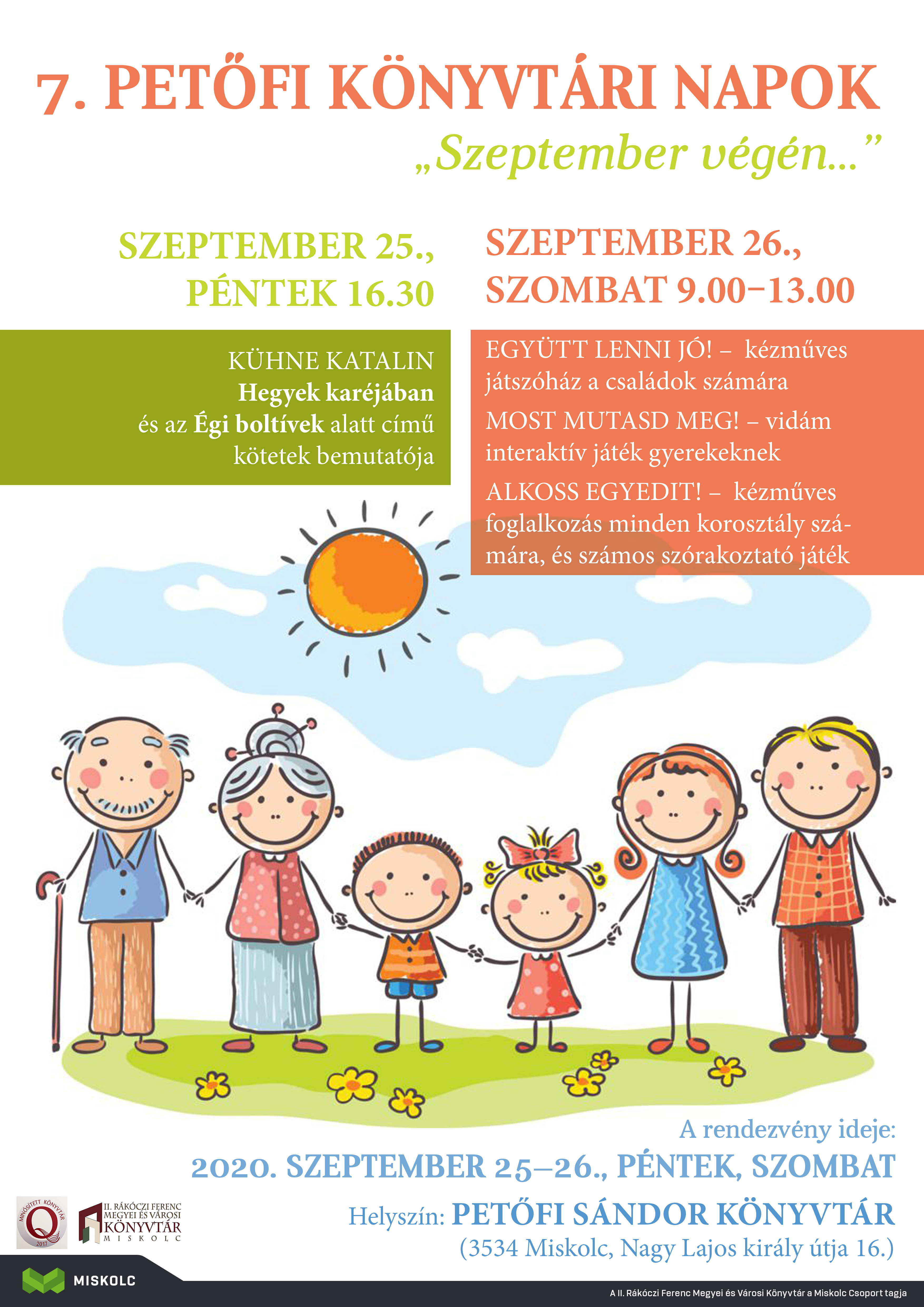 Immár 7. alkalommal szervezik meg Miskolcon a Petőfi Sándor Könyvtárban a Petőfi-napokat. A diósgyőri városrészben szeptember 25-én és 26-án is érdekes programokkal várják az érdeklődőket. A II. Rákóczi Ferenc Megyei és Városi Könyvtár Petőfi Sándor Könyvtára hagyományteremtő szándékkal, a Szeptember végén című Petőfi-vershez kapcsolódva rendezi az első őszi hónap végén programját. Idén is kétnapos lesz a rendezvény, az első nap, szeptember 25-én 16:30-tól Kühne Katalin: Hegyek karéjában, valamint az Égi boltívek alatt című köteteinek bemutatójára invitálják az irodalom szerelmeseit. A könyvből a szerző családjának történetét ismerteti meg az olvasó, melyből elénk tárul országunk történelme is.