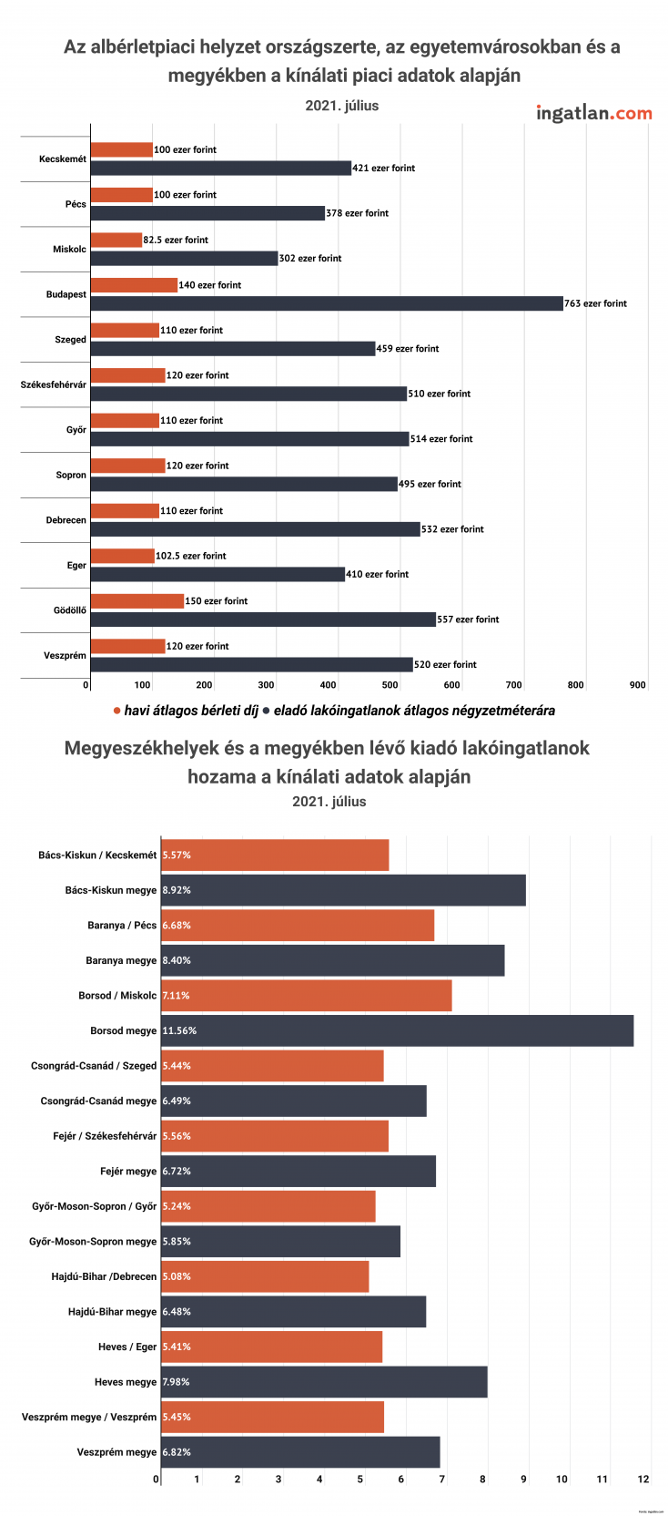 “Az egyik legfontosabb változás az, hogy idén országosan csak 3 százalékkal nőtt az albérletpiaci kereslet, miközben a fővároson kívüli bérelhető lakóingatlanok iránti érdeklődés 13 százalékkal nőtt éves összevetésben. Ez a két számjegyű növekedés pedig elsősorban a megyeszékhelyek és az egyetemvárosok fokozódó népszerűségének köszönhető. Egy másik látványos adat szerint országos átlagban 2015 óta duplájára nőtt a kiadó lakóingatlanok iránti kereslet, ezzel szemben a fővároson kívüli piacon megtriplázódott” - jellemezte a trendeket Balogh László, az ingatlan.com vezető gazdasági szakértője. Hozzátette: További változás a korábbi időszakhoz képest, amely hozzájárul a kereslet erősödéséhez, hogy ma már a Budapesten kívüli piac a befektetők számára is vonzóbb célpont lehet, elsősorban az egyetemvárosokban, mégpedig a diákokhoz évről évre köthető kereslet és ezzel összefüggésben az elérhető hozamok miatt. Korábban a befektetési célú vásárlásoknak elsősorban Budapest adott helyet, de azzal, hogy sok megyeszékhelyen a lakóingatlanok eladási ára arányosan alacsonyabb, mint az elérhető bérleti díj, ezért ezek a nagyvárosok felkerülhetnek a lakásbefektetésben gondolkodók térképére. Emellett a gazdaság újraindulása miatt élénkülő munkaerőpiac is segítheti az különböző nagyvárosok albérletpiacának erősödését.