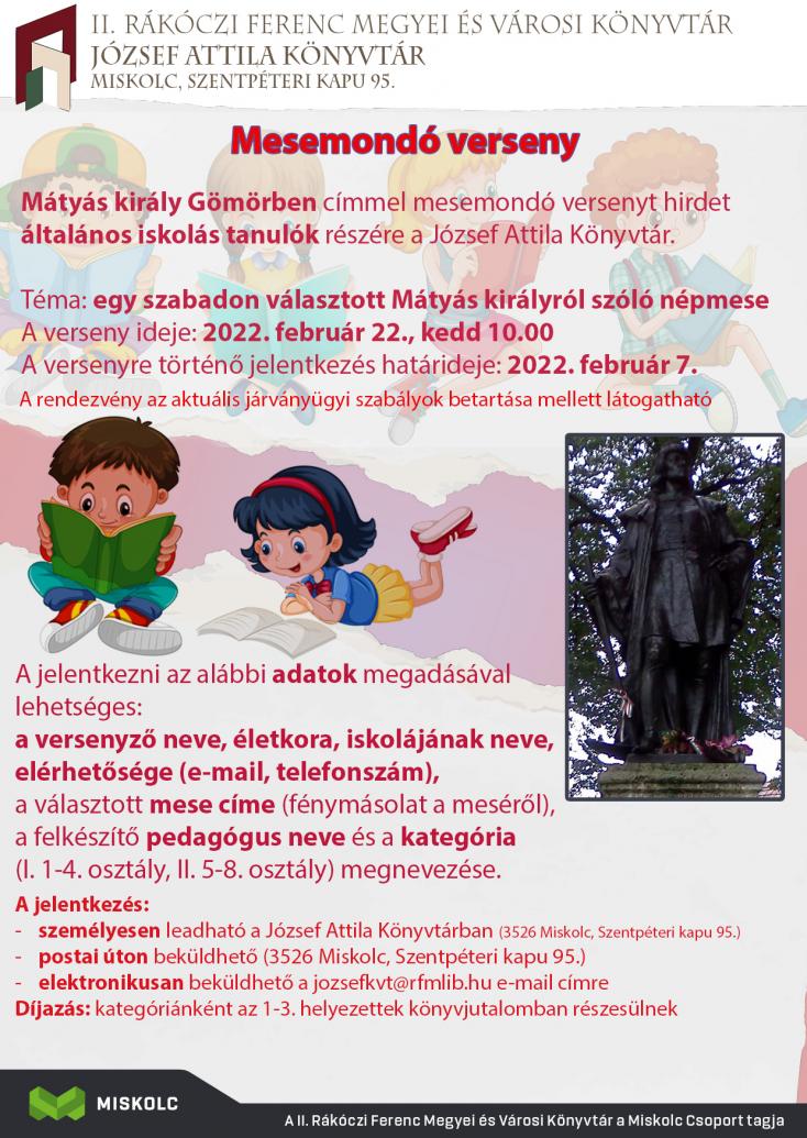 A népszerű Mesék Mátyás királyról című a televíziókban ma is látható rajzfilmsorozatnak is köszönhetően reneszánsz királyunkról sokaknak eszébe jutnak a népmesék, vagy éppen a mondák. Ajándékba száz botütés, Mátyás és a főbíró, A vadász és a huszár, valamint Mátyás király Jénében egyaránt térségünkhöz, a történelmi Gömör vármegyéhez kapcsolódó történetek. A versenyre nemcsak ezekkel a népmesékkel lehet nevezni, hiszen a Hunyadi Mátyásról szóló népmesék tárháza igazán bőséges, lehet miből válogatni a fiataloknak. A verseny részleteiről a József Attila Könyvtár facebook-oldalán tájékozódhatnak. Ugyanitt a könyvtár munkatársai segítenek a választásban is, Mátyáshoz kapcsolódó különböző online tartalmak megosztásával. Az „ifjú mesemondóknak” a kiválasztott szöveget 2022. február 7-ig kell eljuttatniuk a József Attila Könyvtárba. Ez történhet személyesen, postai úton (3526 Miskolc, Szentpéteri kapu 95.), vagy elektronikusan a jozsefkvt@rfmlib.hu. A jelentkezők két korosztályban versenyeznek: 1-4., valamint az 5-8. osztályosok kategóriájában. Az 1-3. helyezettek könyvjutalomban részesülnek. A mesemondó verseny döntőjét 2022. február 22-én, kedden 10 órától rendezik a József Attila Könyvtárban.