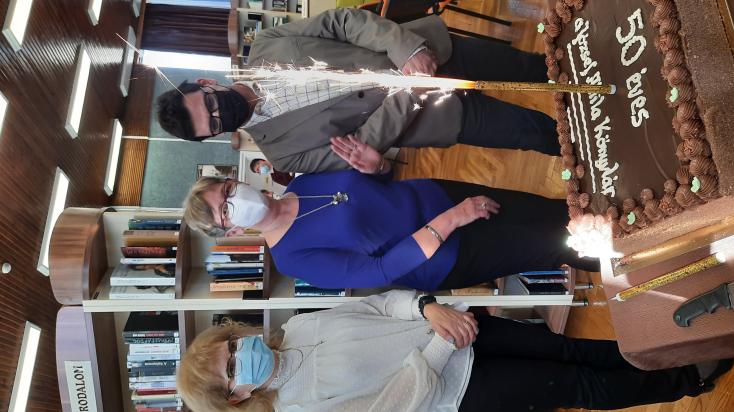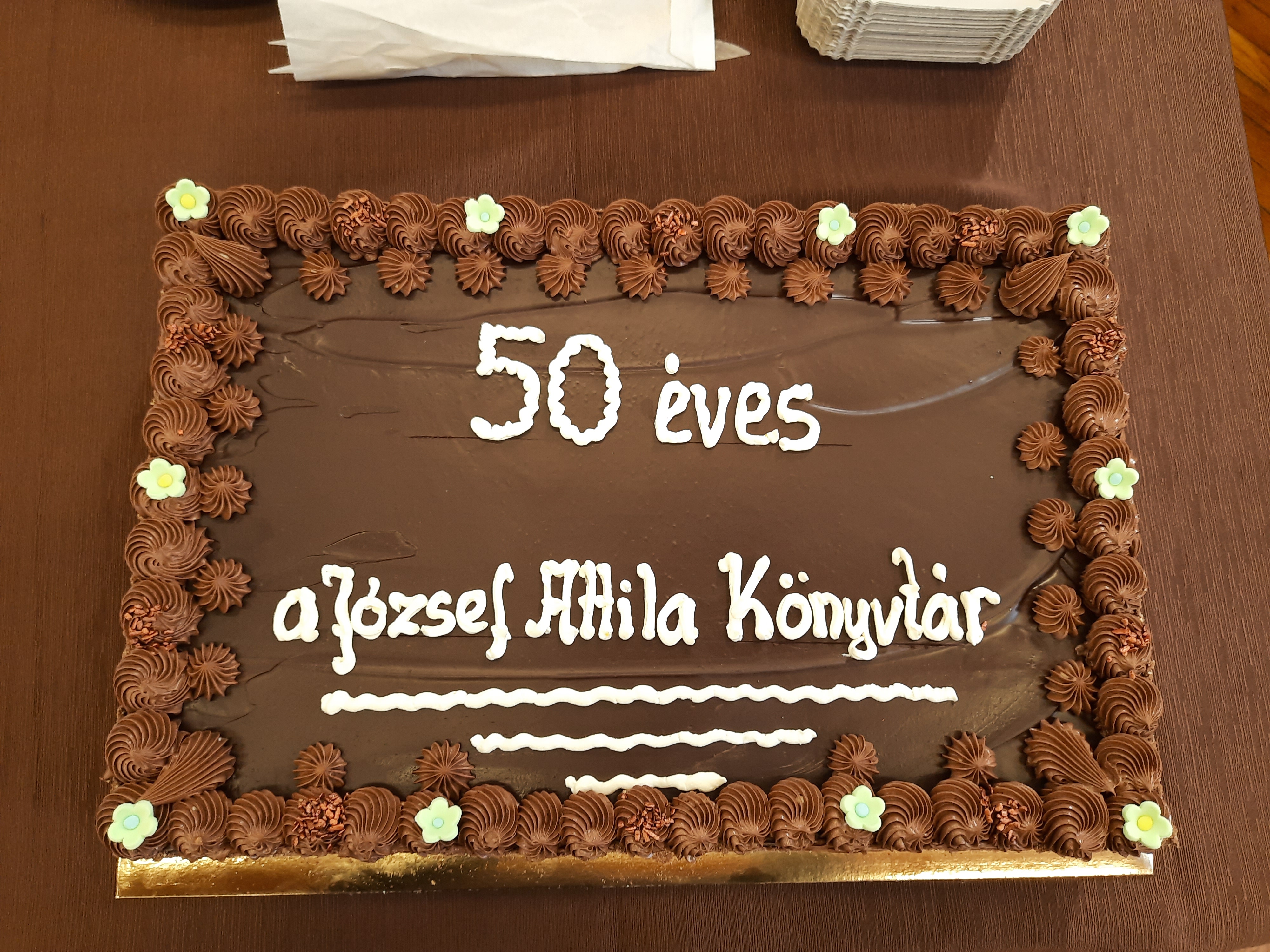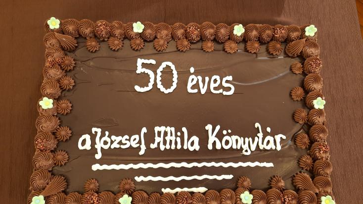 Az ünnepség végén az ünnepelt, – azaz az 50 éves József Attila Könyvtár – tiszteletére csokoládétortával kedveskedtek az intézmény munkatársai.