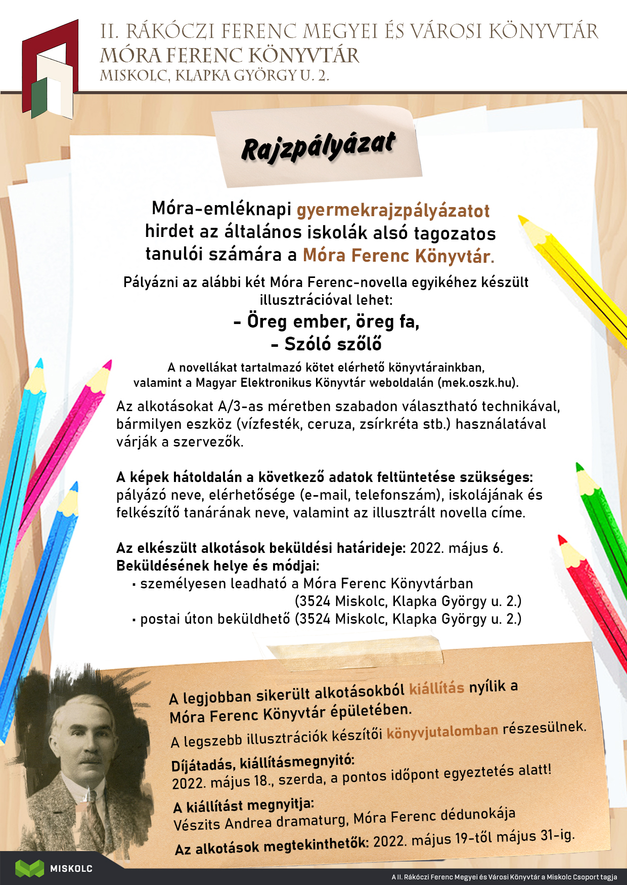Az alkotások A/3-as méretben szabadon választható technikával (vízfesték, ceruza, zsírkréta stb.) használatával elkészíthetők. Az illusztrációk beküldési határideje: 2022. május 6. A pályaműveket leadhatják személyesen a Móra Ferenc Könyvtárban, vagy eljuttathatják postai úton is az intézmény címére (3524 Miskolc, Klapka György u. 2.) A novellákat tartalmazó kötet elérhető könyvtárainkban, valamint a Magyar Elektronikus Könyvtár weboldalán (mek.oszk.hu). A zsűri által legszebbnek ítélt illusztrációk készítői könyvjutalomban részesülnek. A legjobban sikerült alkotásokból kiállítás nyílik a Móra Ferenc Könyvtár, melyet Vészits Andrea dramaturg, Móra Ferenc dédunokája nyit meg 2022. május 18-án, szerdán. Az alkotások megtekinthetők: 2022. május 19-től május 31-ig, hétköznapokon 10 és 18 óra között a könyvtár nyitvatartási idejében.