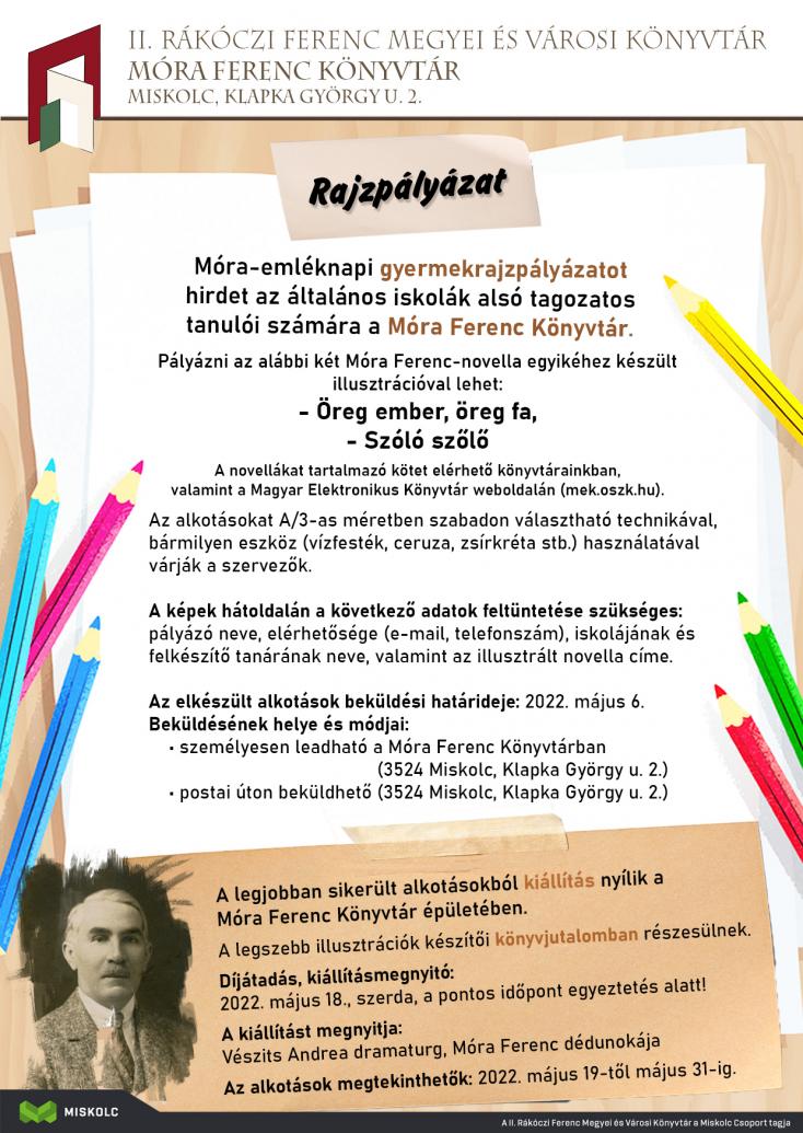 A Móra-emléknaphoz kapcsolódóan pályázatot hirdet az általános iskolák alsó tagozatos tanulói számára a Móra Ferenc Könyvtár (3524 Miskolc, Klapka György u. 2.). A szervezők az Öreg ember, öreg fa és a Szóló szőlő című Móra Ferenc-novella egyikéhez készült illusztrációkat várnak.