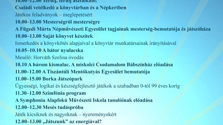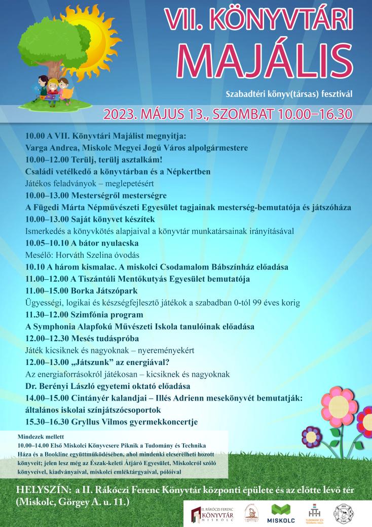 A Miskolc város napjához kapcsolódó eseményt május 13-án, 10 órakor Varga Andrea Miskolc Megyei Jogú Város alpolgármestere nyitja meg a II. Rákóczi Ferenc Könyvtár központi épülete előtti téren (Miskolc, Görgey A. u. 11.). A programok sorát egy tehetséges óvodás, Horváth Szelina produkciója nyitja, aki A bátor nyulacska történetét meséli el. A Miskolci Csodamalom Bábszínház jóvoltából A három kismalac című bábelőadását tekinthetik meg, de a könyvtár minden korosztályra gondolt, kicsikre és nagyokra egyaránt. A szervezők ismét különleges élményekkel teli versengésre invitálják a játékos kedvű olvasókat. A Terül, terülj asztalkám! elnevezésű vetélkedőn a családok a könyvtárban és a szabadtéren – vagyis a Népkertben – egyaránt mesés feladványokkal találkozhatnak, amelynek középpontjában a mesék állnak. A játékok mellett ismeretterjesztő program is várja az érdeklődőket, dr. Berényi László egyetemi oktató beszél az energiaforrásokról, a játékos elemekkel tarkított előadás igazán izgalmasnak ígérkezik. A könyvtári majálison délután is teret kapnak a fiatal tehetségek. A Symphonia Alapfokú Művészeti Iskola tanulói zenés műsorral lepik meg a közönséget, majd 3 intézmény a Diósgyőri Nagy Lajos Király Általános Iskola, a Fazekas utcai Általános Iskola és Alapfokú Művészeti Iskola, valamint a Nyékládházi Kossuth Lajos Általános Iskola színjátszó csoportjainak közreműködésével Illés Adrienn: Cintányér kalandjai című mesekönyve elevenedik meg a szerző jelenlétében.