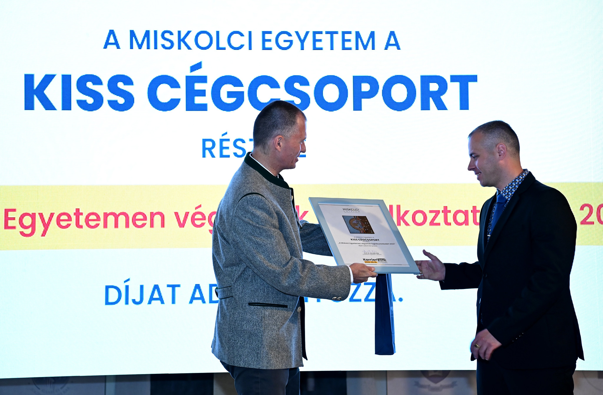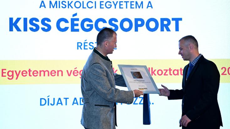 A hallgatói karrierutak támogatásában, a megye és a régió fejlődésének megerősítésében és versenyképességének növelésében elkötelezett munkát végez a Miskolci Egyetem – ezt már Dr. Alakszai Zoltán, a Borsod-Abaúj-Zemplén Vármegyei Kormányhivatal főispánja fogalmazta meg köszöntőjében. A megye aktuális foglalkoztatási adataira utalva elmondta: napjainkban a munkaerőtartalék megtalálása a legfőbb feladat. A Miskolc- Debrecen-Nyíregyháza „háromszögben” jelentős fejlesztéseket tervez a kormány, amit a szakemberek új generációjának a kinevelésével az egyetem hatékonyan támogatni tud. A KarrierFeszt 2023 megnyitóján adták át a „Miskolci Egyetemen végzettek foglalkoztatásáért” díjat. A tudományos utánpótlás-nevelés, a műszaki és informatikai életpálya támogatását díjazó, 2010-ben alapított elismerést idén a KISS CÉGCSOPORT-nak ítélte oda az egyetem szenátusa. A díjat ifj. Kiss László, az ÉMK Észak-Magyarországi Környezetvédelmi Kft. ügyvezetője vette át, aki a magyar tulajdonú társaság nevében elmondta: számítanak az egyetemen végzett szakemberek tudására. Jelentős sikernek értékelik, hogy az Anyag- és Vegyészmérnöki Kar Kémia Intézetében hozzájárulhattak a tevékenységi körüket támogató Finomvegyipari és Környezettechnológiai Tanszék kialakításához. A Miskolci Egyetem KarrierFeszt 2023 rendezvényén a munkát keresők személyesen találkozhattak a cégek képviselőivel, közvetlenül is jelentkezhettek a különböző állásokra, és értékes tippeket kaphattak a sikeres