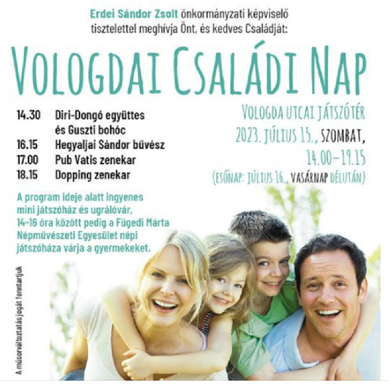 Vologdai Családi Napot rendeznek Miskolcon. Nemcsak az ott élőknek ígér kellemes kikapcsolódást a Vologdai Családi Nap, amelyet 2023. július 15-én szombaton rendeznek meg a Vologda utcai játszótéren 14.00 és 19.15 óra között. (Esőnap: július 16., vasárnap délután)