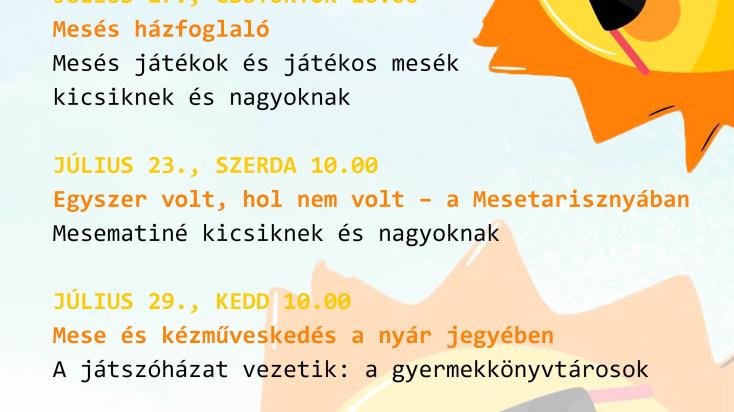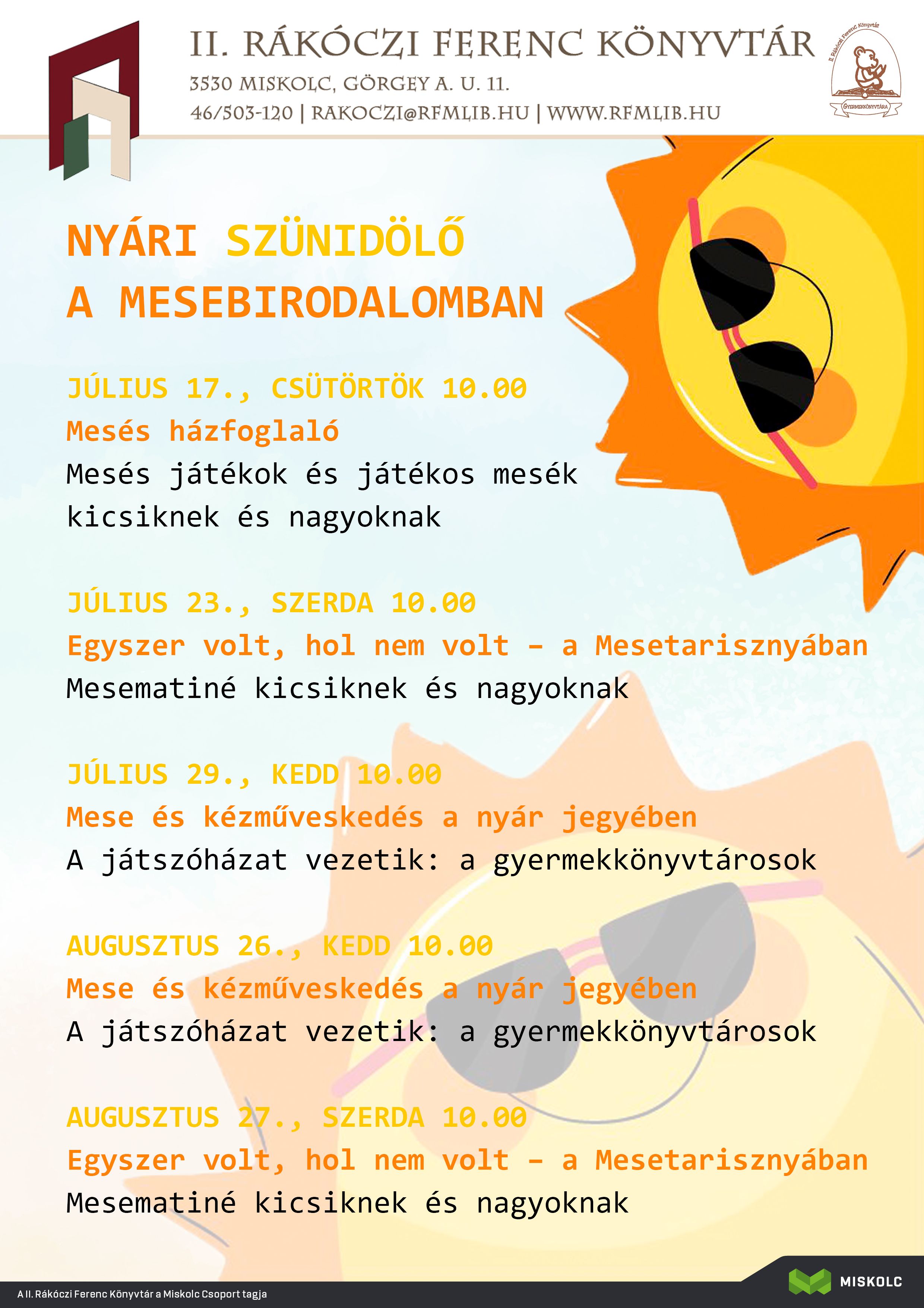 A II. Rákóczi Ferenc Könyvtár (Miskolc, Görgey u. 11.) a nyári szünetben sem feledkezik meg a legkisebb olvasóiról, vagyis az óvodásokról és az iskolásokról, valamint szüleikről. Intézményünk júliusban 3, augusztusban pedig két programmal várja az érdeklődőket. Az első rendezvényre július 17-én, csütörtökön 10 órától kerül sor, amikor is az úgynevezett "házfoglaló" játék várja az érdeklődőket. Itt a mesés játékok és játékos mesék várják az olvasókat. A résztvevők előtt megelevenednek a mesehősök egy mesebeli világba csöppenhetnek a résztvevők. A gyerekeknek különböző kreatív feladatokat kell megoldaniuk, melyek középpontjában természetesen a mesék állnak. Július 23-án, szerdán ugyancsak 10 órától az Egyszer volt, hol nem volt – a Mesetarisznyában Mesematiné kínál kellemes kikapcsolódást kicsiknek és nagyoknak egyaránt. Az élőszavas mesélésnek már hagyománya van a II. Rákóczi Ferenc Könyvtárban. Szeretik a gyerekek mindezt, hiszen a könyvtárosok a résztvevők bevonásával igyekeznek mesélni és játékos feladatokkal színesíteni a délelőttöt. A július utolsó gyermekeknek szóló programjára július 29-én, kedden délelőtt 10 órakor kerül sor, amikor Mese és kézműveskedés a nyár jegyében címmel számítanak az óvodások és iskolások részvételére a gyermekkönyvtárosok. A gyerekek már most várják a programokat, hiszen valamennyi új élményt kínál számukra. Augusztusban 26-án, kedden ismét lesz kézműveskedés, másnap 27-én szerdán pedig újból a mesék csodálatos világába juthatnak el a gyerekek. Mindkét program délelőtt 10 órakor kezdődik. Érdemes ellátogatni a II. Rákóczi Ferenc Könyvtár központi épületébe (Miskolc, Görgey u. 11.), hiszen az első emeleten a gyermekkönyvtárban, vagy ahogy gyerekek is nevezik a Mesebirodalomban számos kaland várja őket a nyári szünetben.