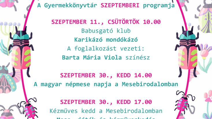 Az intézmény első szünidő utáni rendezvényére szeptember 11-én, csütörtökön 10 órára várják az érdeklődőket. A Babusgató karikázó, mondókázó foglalkozás Barta Mária Viola színész vezetésével elsősorban a legfiatalabb korosztályt, azaz a 0-3 éveseket és szüleit szólítja meg.