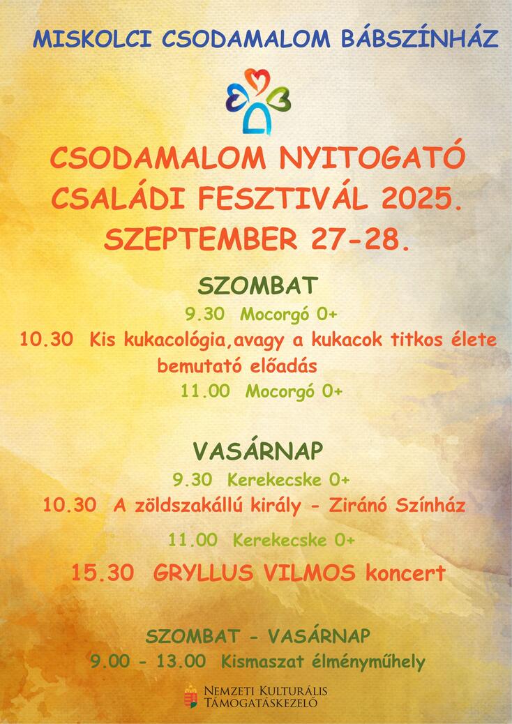 A Miskolci Csodamalom Bábszínház 2025. szeptember 27–28-án rendezi meg a Csodamalom Nyitogató Családi Fesztivált, amely két napon át színes programokkal várja a kicsiket és nagyokat.
