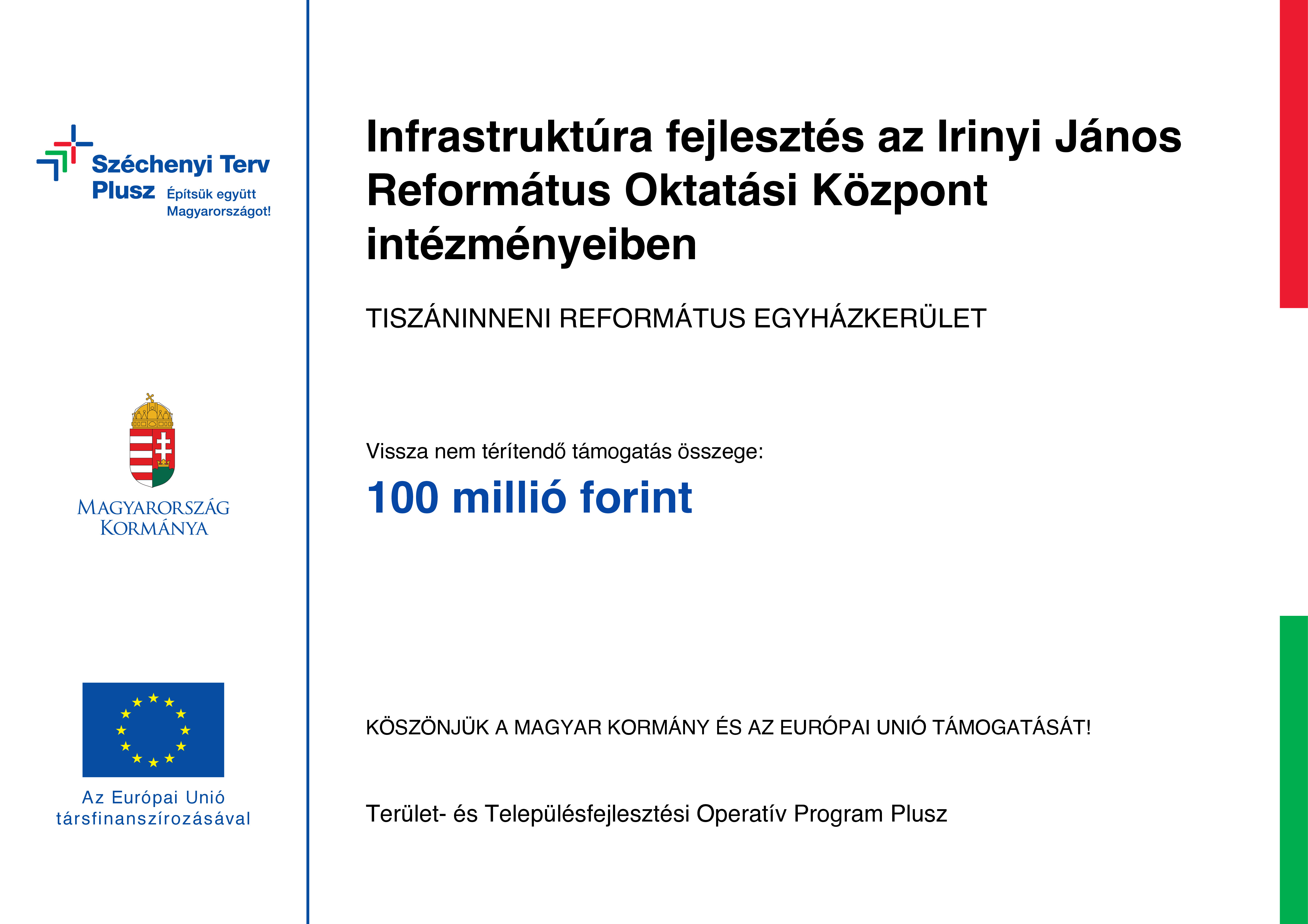 A TOP_PLUSZ-3.3.3-23-BO2-2024-00005 azonosító számú, "Infrastruktúra fejlesztés az Irinyi János Református Oktatási Központ intézményeiben” című projekt keretében a Tiszáninneni Református Egyházkerület fenntartásában lévő oktatási intézményekben valósul meg infrastruktúra fejlesztés. A projektre megítélt vissza nem térítendő támogatás összege 100.000.000. Ft. Köszönjük a Magyar Kormány és az Európai Unió támogatását.
