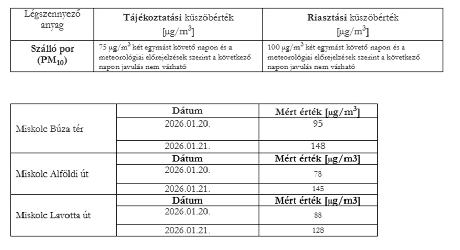 Az automatikus mérőállomásokon a szálló por (PM10) koncentráció túllépte a tájékoztatási küszöbértéket ezért a 306/2010. (XII.23.) Korm. rendelet és a 30/2013.(X.1.) önkormányzati rendelet alapján elrendelték Miskolcon a füstköd-riadó tájékoztatási fokozatát.