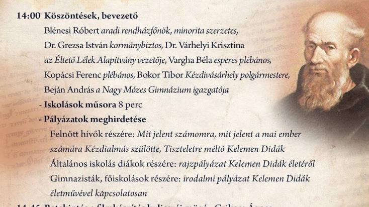 A mintegy másfél órás dokumentumfilm bemutatója szeptember 14-én pénteken 14 órától lesz a kézdivásárhelyi Vigadó Művelődési Központban, ahol a vetítés előtt szót kap Dr.Grezsa István kormánybiztos, Belénesi Róbert aradi rendházfőnök, Dr.Várhelyi Krisztina az Éltető Lélek Alapítvány vezetője, Vargha Béla esperes plébános, Beján András, a Nagy Mózes Gimnázium igazgatója. A forgatás kulisszái mögé enged bepillantást a film rendezője Czikora Ágnes, a BluePixel Kommunikációs és Produkciós Iroda igazgatója. A vetítést beszélgetés követi és a Kelemen Didák pályázatok meghirdetése felnőttek, gimnazisták és általános iskolások számára.