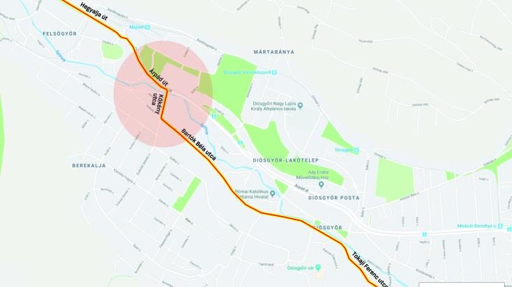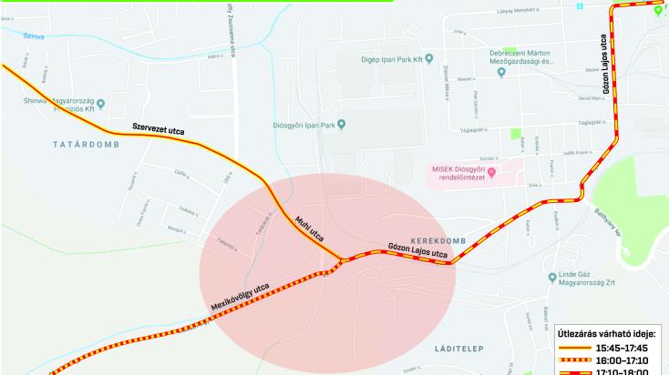 • 17:10-18:00 óra között: Gózon Lajos utca, Vasgyári út, Kiss Ernő utca, Geró János utca, Petőfi Sándor utca, Rácz György utca, Meggyesalja utca, Kálvin János utca, Papszer utca, Szemere Bertalan utca, Uitz Béla utca. Ebben az időszakban az Egyetem felől Diósgyőr irányába a Vargahegyi út a vasúti átjárónál kerül lezárásra.