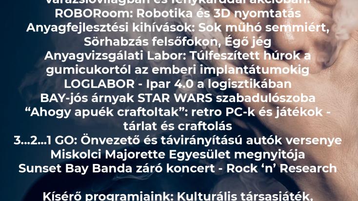 Az idei esztendőben több új elemmel is kiegészül a Kutatók éjszakájának programkínálata a miskolctapolcai telephelyen. A már több éve nagy érdeklődésre számot tartó események mellett új, látványos programelemeket is felvonultatnak a kutatók. Az Anyagfejlesztési valamint Anyagvizsgáló Laboratóriumokban laborvezetés mellett tekinthetnek meg a látogatók izgalmas fizikai és kémiai kísérleteket, megismerkedhetnek egyedülálló eszközparkunkkal és megtudhatják, aktuálisan milyen vizsgálatok és kutatások folynak Intézetünkben. A Robot-teremben többek között a BayBoy robotok várják a kisebbeket és nagyobbakat, valamint 3D nyomtatással készült figurák kiállítása is megtekinthető lesz, a 3D nyomtatási folyamat demonstrációján túl. Az IPAR 4.0-t, az ipari digitalizációt érintő kihívásokra adott látványos válaszokkal találkozhatnak a logisztika iránt érdeklődők, míg a Virtuális Valóság termeiben újra belebújhatnak az ismert varázslótanonc bőrébe, hogy seprűnyélre pattanva tegyék próbára repülési képességeiket. A jövő technológiáiból az önvezető autó virtuális volánja mögé ülve a múltba kanyarodunk, ennek keretében az „Ahogy apuék craftolrak” programban régi számítógépeket és PC játékokat tudnak kipróbálni a vendégek. Játékos logikai vetélkedő keretében hangsúlyt helyeznek a fiatalok környezettudatos szemléletformálására, de ki lehet próbálni a BAY-jós árnyak szabaduló szobát, valamint egy honismereti társasjátékot is, míg a kisebbek többek között a slime-mániás boszorkánykonyhában serénykedhetnek. A fesztivál hangulatot az idén 35 éves Miskolci Mazsorett Együttes megnyitója alapozza meg, zárásként pedig egy igazi kuriózummal találkozhatnak a vendégek, hisz a Bay Zoltán Kutatóintézet kollégáiból a kizárólag erre az alkalomra összeállt Sunset Bay Banda rock’n’research hangulattal búcsúzik a 2019-es Kutatók éjszakájától.