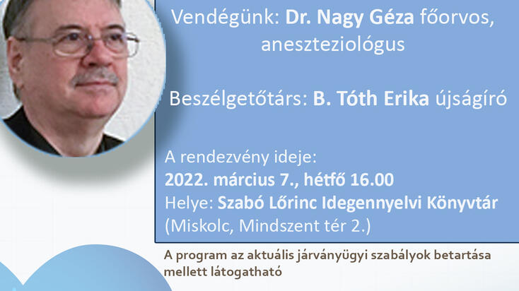 Sorozatunkban korábban már bemutatkozott: dr. Révész János, a Borsod-Abaúj-Zemplén Megyei Központi Kórház és Egyetemi Oktatókórház főigazgatója, dr. Nagy Gábor, szülész-nőgyógyász, centrumvezető főorvos, dr. Almássy Sándor, mellkassebész főorvos, dr. Karosi Tamás, fül-orr-gégész, osztályvezető főorvos, valamint legutóbb 2021 novemberében dr. Wijesinghe Ivor, andrológus, urológus, klinikai onkológus főorvos. A sorozat folytatásában dr. Nagy Géza aneszteziológus főorvossal, B. Tóth Erika újságíró beszélget. A program nemcsak egészségügyi témákat érint, hiszen a portréból megismerhetik a magánembert is. Kérjük, részvételi szándékát előzetesen jelezze 2022. március 4-ig a 46/344-851-es telefonszámon, vagy a szabolib@rfmlib.hu e-mail címen, illetve személyesen a rendezvény helyszínén.
