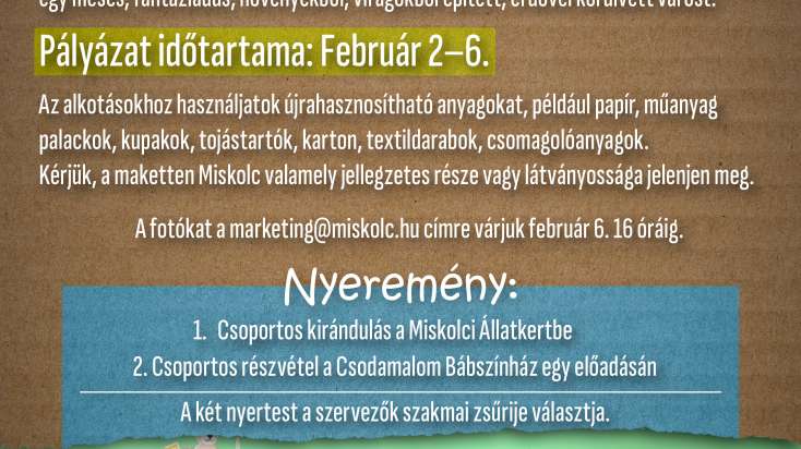 Miskolc Megyei Jogú Város Önkormányzata és a Miskolci Fejlesztési Központ újabb kreatív pályázatra hívja a miskolci óvodákat. A korábbi, nagy sikerű hóépítményversenyt követően ezúttal a „Varázslatos zöld Miskolc” elnevezésű makettversenyen mutathatják meg az óvodás csoportok, hogyan képzelik el a város természetközeli, zöld jövőjét.