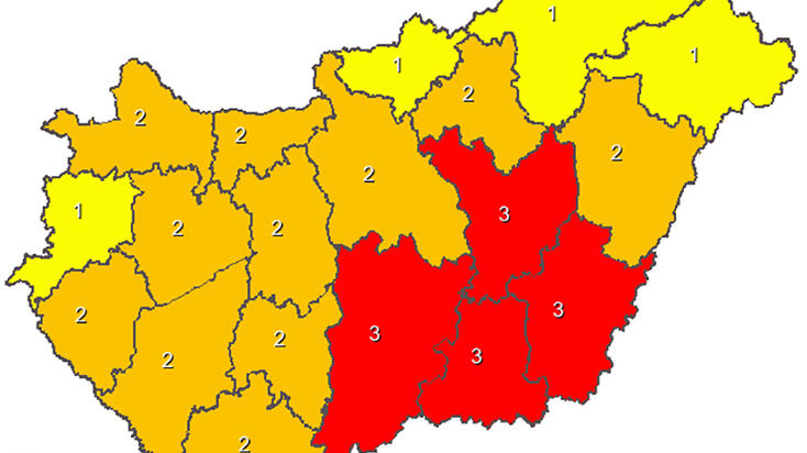 Szerdára már négy megyére adta ki legmagasabb fokú (piros) figyelmeztetését a hőség miatt a meteorológiai szolgálat. E szerint Bács-Kiskun, Békés, Csongrád és Jász-Nagykun-Szolnok megyében van érvényben a harmadfokú figyelmeztetés. A fővárosra és tizenegy megyére másodfokú, míg Borsod-Abaúj-Zemplén, Nógrád, Szabolcs-Szatmár-Bereg és Vas megyére elsőfokú figyelmeztetést adtak ki szerdára a hőség miatt.